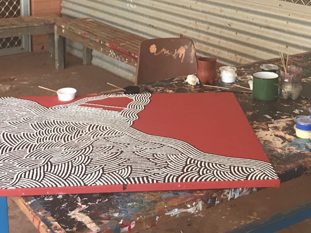 Visite d’un centre d’art eu plein cœur du désert central australien, à plusieurs centaines de kilomètres d’Alice Springs , dans le village de Yuendemu, les artistes travaillent isolés des uns des autres au soleil ou en groupe sur la terrasse de la maison.
