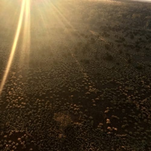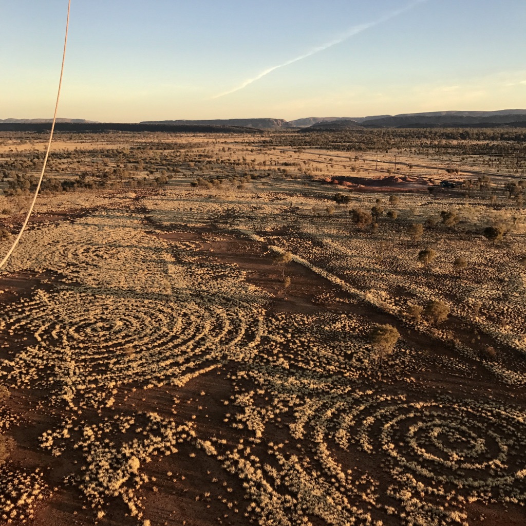 La couleur ocre rouge du territoire aborigène se cache dessous les petits arbustes secs et jaunis par le soleil. Les chemins se dessinent …se brouillent comme dans les interprétations des artistes sur leurs toiles. En prenant de la hauteur le pointillisme “aborigène” s’explique et se dévoile …